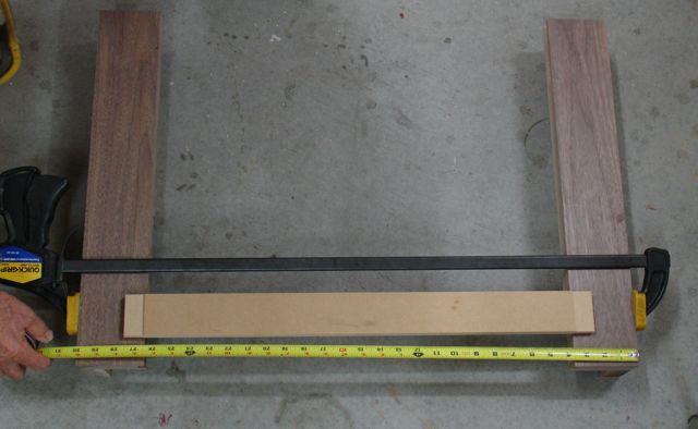 For this commission the legs need to be strong and have some mass to offset the Travertine tops. Another consideration for this design was that the base of the table should not be so large and overpowering that it would hide the floor. I was given a photograph of a table they liked which had large, square legs so that's what I went with. To save material costs and also give the base a lean appearance I decided to make the legs shown above. The first step was to determine the widest possible pieces of sapwood free Walnut that I could yield from the material available. This is the leg for the coffee table and the width is 4 3/8", the two end tables have a width of 3 1/2". Speaking about the material, there wasn't enough sap free Walnut to get the aprons for the end tables so I had to special order more which should arrive Monday.